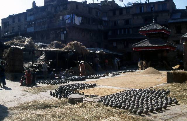 Die fertigen Gefäße stehen zum Trocknen in der Sonne. An der Herstellungsmethode hat sich wohl seit Jahrhunderten nichts geändert. Im Hintergrund der Jeth-Ganesh-Tempel, der 1646 von einem reichen Töpfer gestiftet wurde. |